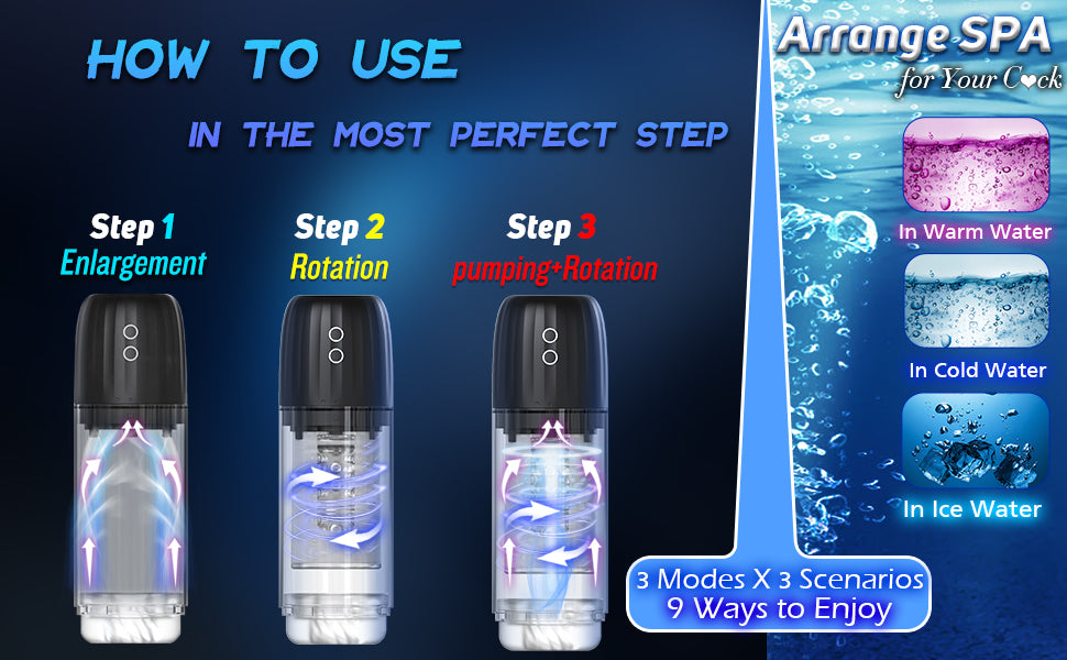 - 🚀【Fully Waterproof Male Sex Toy for SPA Massage】 Thanks to the new technology, you can fill the masturbator cup with ice & cold water to train your little man's sensitivity, then fill it with warm water to provoke your desire. In this way, you can continuously train your shaft to strengthen the pleasure of climax. Y